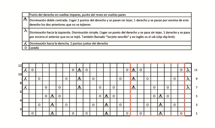 Monta 25 puntos: vuelta 1: 1 derecho, *lazada, 2 der, disminucion doble centrada, 2 der, lazada, 1 der* 3 veces vuelta 2 y todas las vueltas pares: todos los puntos del revés vuelta 3: 2 derecho, *lazada, 1 der, disminucion doble centrada, 1 der, lazada, 3 der* 2 veces, lazada, 1 der disminución doble centrada, 1 der, lazada, 2 der vuelta 5: 3 derecho, *lazada, disminucion doble centrada, lazada, 5 der* 2 veces, lazada, disminucion doble centrada, lazada, 3 derecho vuelta 7: disminución simple, 2 derecho, lazada, 1 derecho, lazada, 2 derecho, *disminucion doble centrada, 2 derecho, lazada, 1 der, lazada, 2 derecho* 2 veces, 2 puntos juntos derecho vuelta 9: disminución simple, 1 derecho, lazada, 3 derecho, lazada, 1 derecho, *disminucion doble centrada, 1 derecho, lazada, 3 der, lazada, 1 derecho* 2 veces, 2 puntos juntos derecho vuelta 11: disminución simple, lazada, 5 derecho, lazada, *disminucion doble centrada, lazada, 5 der, lazada* 2 veces, 2 puntos juntos derecho Repetir de la vuelta 1 a la 12 tantas veces como se quiera